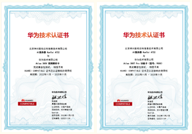 近日,PT电子 A722服务器通过华为“Atlas 300V 视频解析卡”以及“Atlas 300T Pro 训练卡(型号:9000)”两项技术认证,为智能算力再添新力!